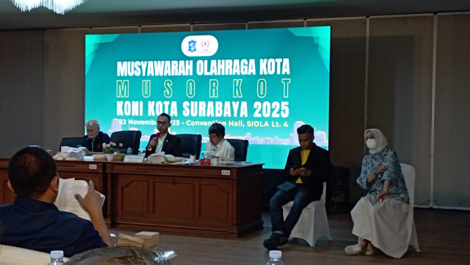 Surabaya, Potretjatim.id — Musyawarah Olahraga Kota (Musorkot) KONI Surabaya 2025 yang digelar di Convention Hall Siola, Sabtu (22/11/2025) mencatatkan sejarah baru. Arderio Hukom resmi terpilih sebagai Ketua KONI Kota Surabaya periode 2025–2029 secara aklamasi, setelah memperoleh dukungan mayoritas cabang olahraga (cabor) yang hadir.