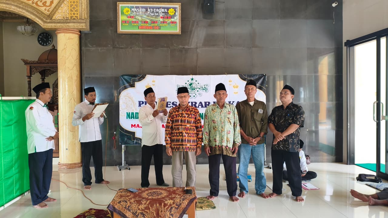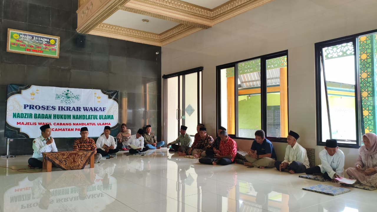 Kediri, potretjatim.id — Selasa (03/03/2026) Kantor Urusan Agama (KUA) Pagu layani permohonan ikrar wakaf tanah Bernazhir NU sebanyak 10 bidang. Prosesi ikrar wakaf yang digelar di Masjid At Taqwa Sitimerto area kompleks KUA Pare siang itu dilaksanakan secara “Moloekatan”. Tampak hadir dalam prosesi ikrar wakaf yang dilaksanakan secara khidmat tersebut para pewakif, para saksi, perwakilan Pengurus dan Nazhir MWC NU Kecamatan Pagu, Penyuluh Agama Islam KUA Pagu, dan Kasi Penyelenggara Zakat dan Wakaf Kantor Kementerian Agama Kabupaten Kediri.